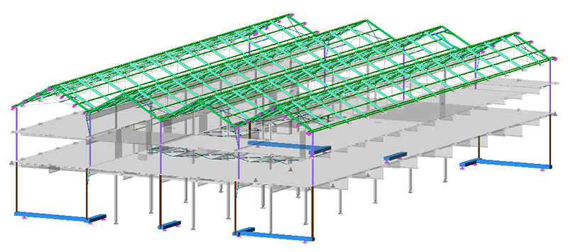 La modélisation est réalisée avec le logiciel Advance Design pour vérifier que le bâtiment existant pouvait reprendre le poids de la nouvelle couverture et optimiser les renforts à mettre en place tout en respectant les nouvelles normes en vigueur.